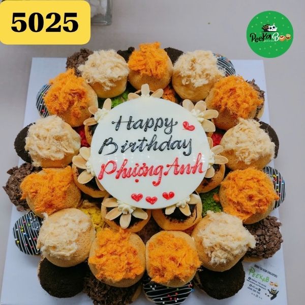 Mẫu bánh su kem này gồm 50 bánh su tròn được sắp xếp thành vòng tròn xung quanh bánh kem trung tâm. Tổng thể bánh sử dụng tông vàng – nâu – đen, tạo cảm giác vừa ấm áp vừa sang trọng.