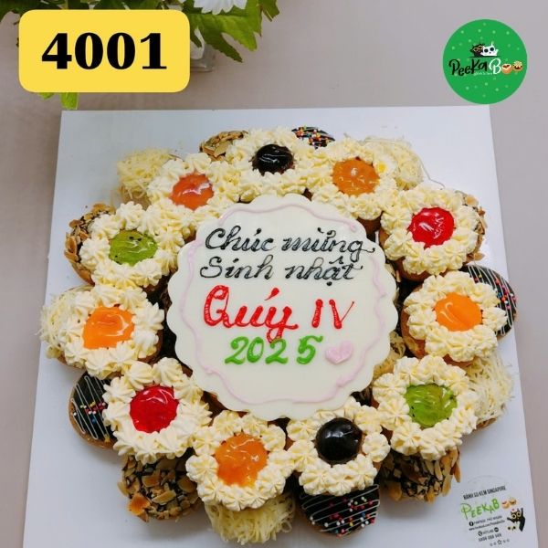Mẫu bánh này gồm 40 chiếc bánh su kem nhỏ, được sắp xếp thành hình tròn với các màu sắc nổi bật, tạo điểm nhấn cho bữa tiệc sinh nhật của bạn gái yêu quý.